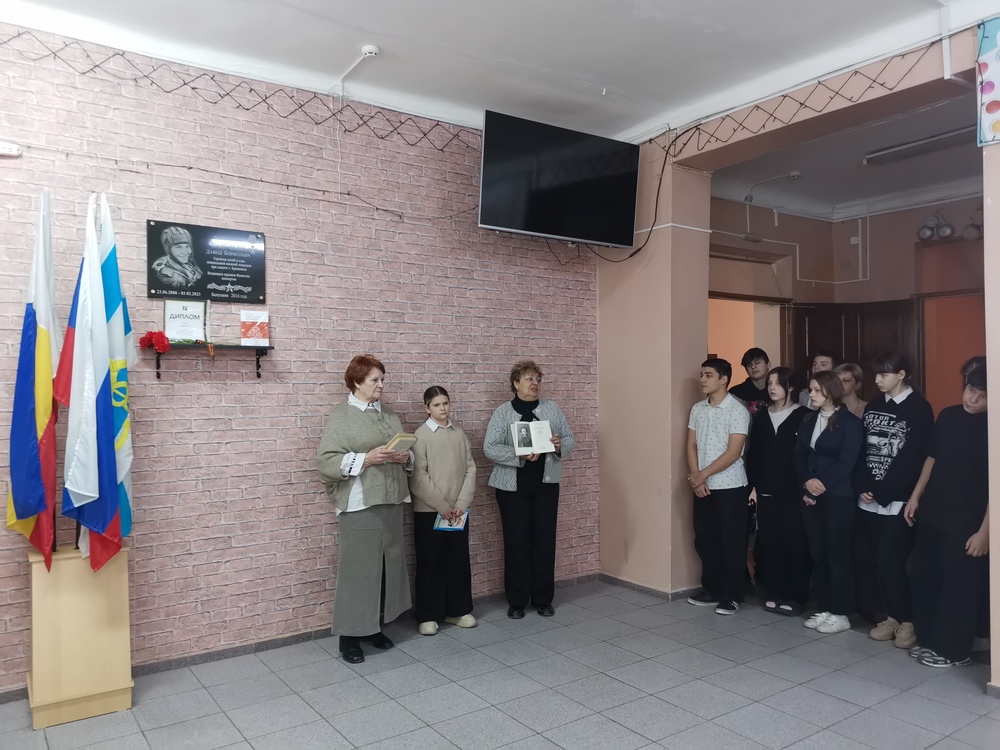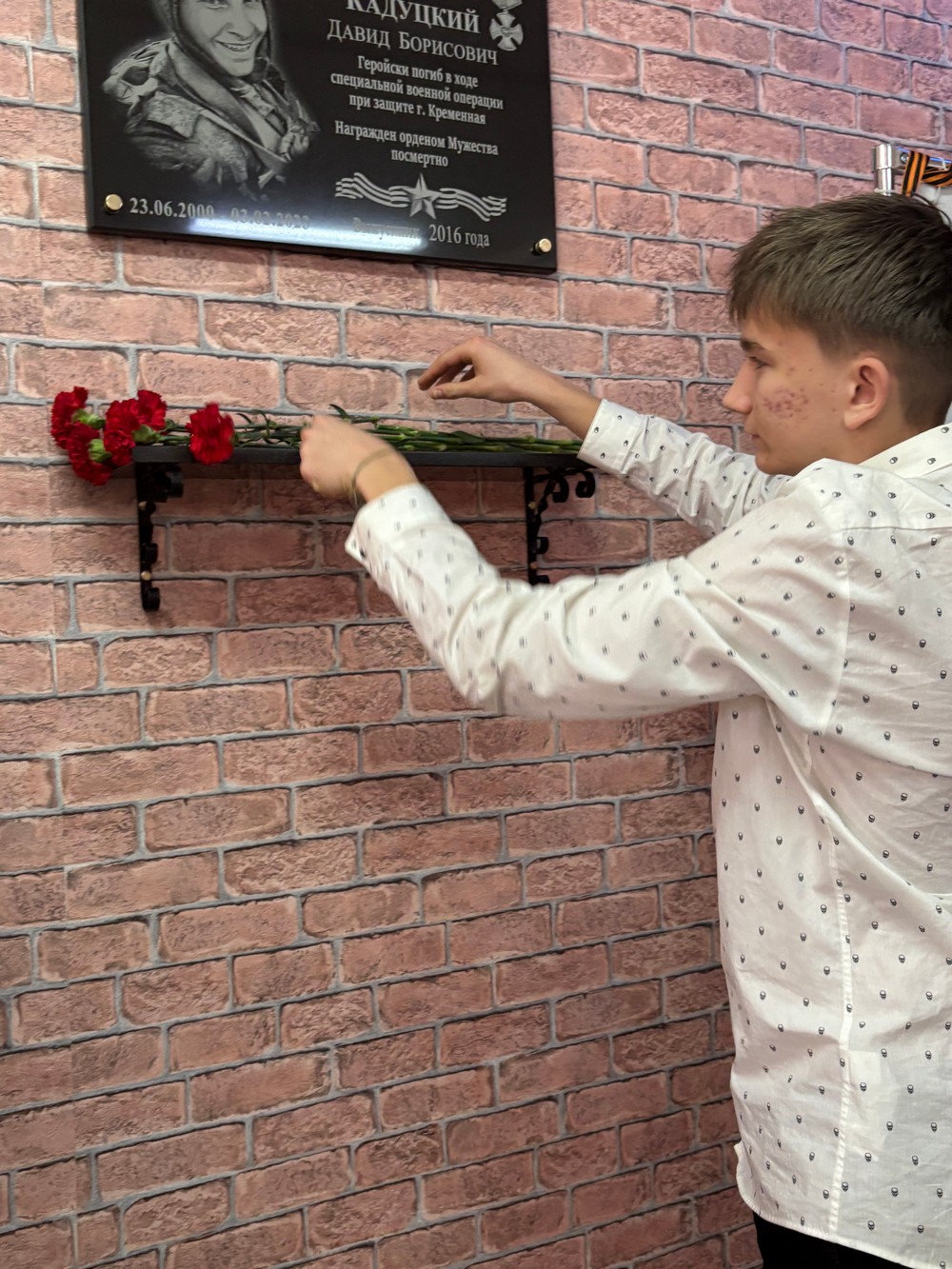 По сложившейся традиции февральские дни в филиале- это дни памяти выпускника 2016 года Давида Кадуцкого, погибшего при выполнении воинского долга в ходе специальной военной операции. По инициативе выпускников в фойе филиала размещена мемориальная доска памяти Давида. Присутствующим был представлен видеофильм, в котором нашел отражение недолгий, но яркий путь Давида от ученика до боевого десантника. И завершилась линейка церемоний возложения цветов к мемориальной доске памяти Кадуцкого Д.Б..