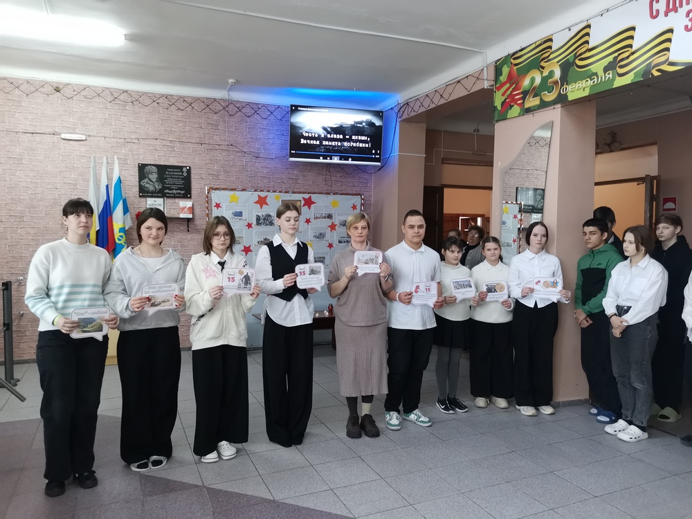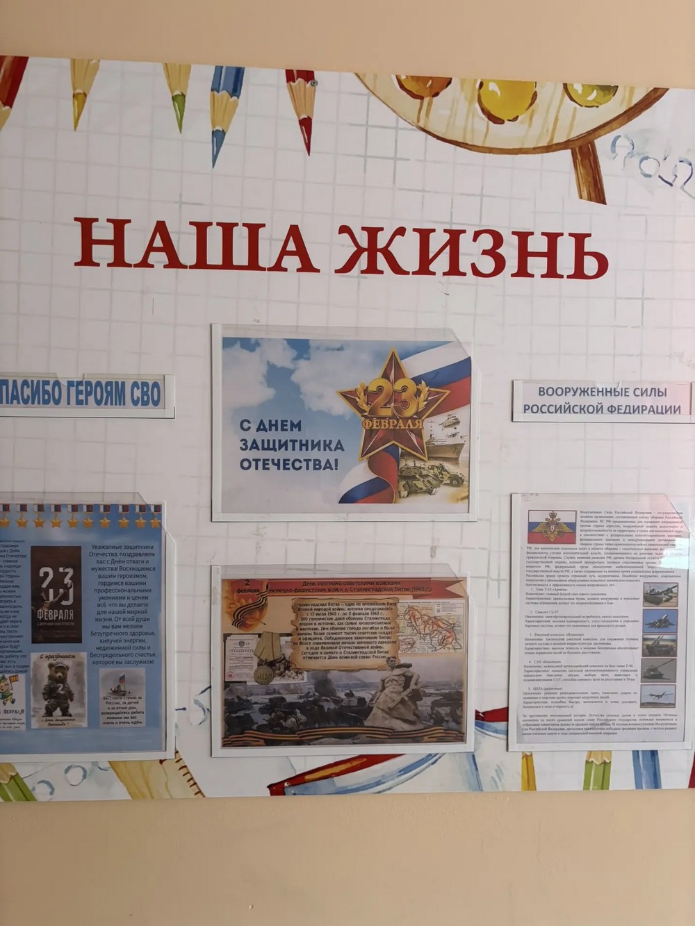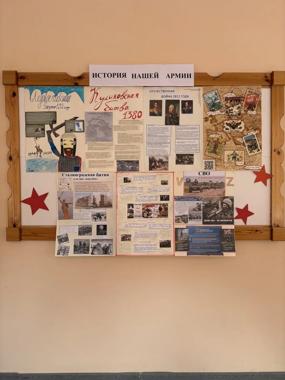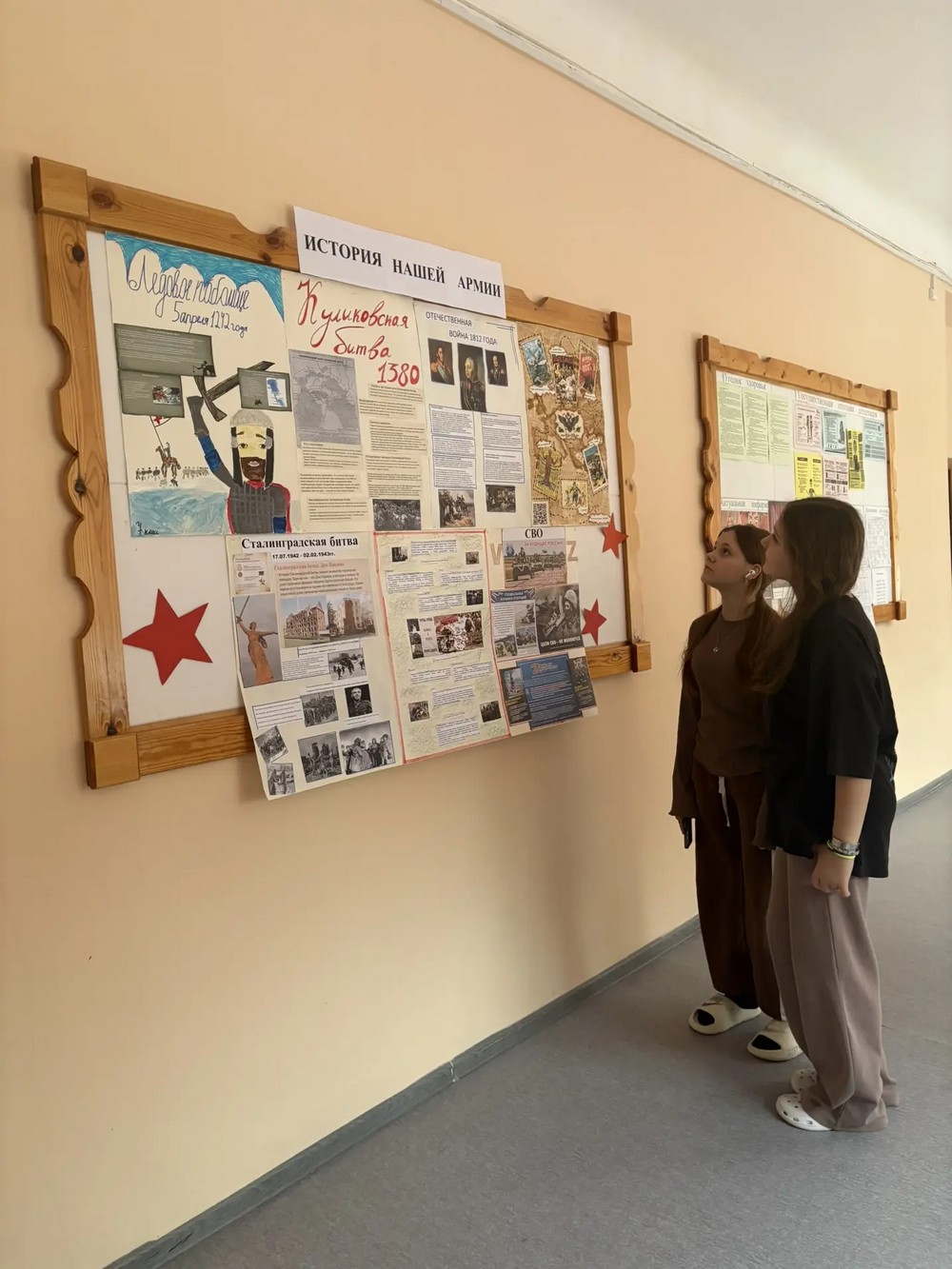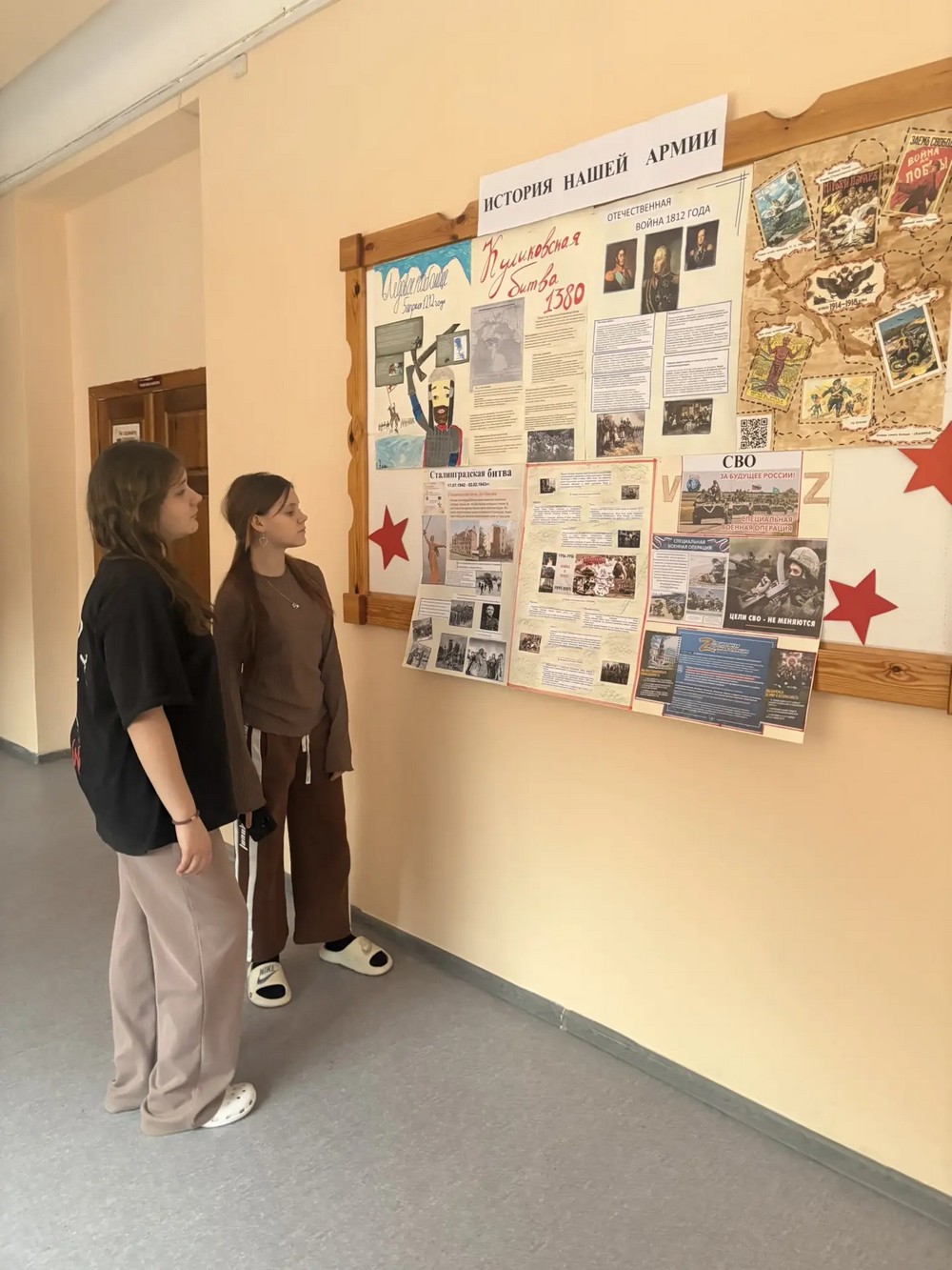 В канун Дня защитника Отечества все классы во главе с классными руководителями подготовили выпуски стенных газет, посвященных ярким страницам истории Российского армии. Каждый класс выбирал событие самостоятельно. Ребята остановились на Ледовом побоище, Куликовской битве, событиях Отечественной войны 1812 года, -Ленинградской битве, Чеченской войне 1999-2009гг. Отдельный выпуск был посвящен специальной военной операции. Газета 10 класса была посвящена фронтовым плакатам. Для тех, кого заинтересовала эта тема, газета предложила воспользоваться QR-кодом для более глубокого изучения этой темы.