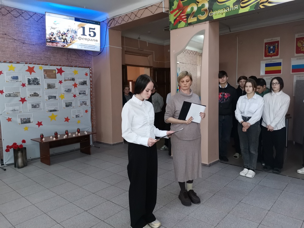 15 февраля отмечен в календаре дней воинской славы как День памяти о россиянах, исполнивших служебный долг за пределами Отечества. Этой знаменательной дате была посвящена торжественная линейка «Когда долг зовет за рубежи Родины». Начали линейку педагог-организатор Ирина Владимировна Пирожкова и ученица 9а класса Кавун Софья. Они напомнили всем присутствующим об исторических традициях в России отмечать военные победы, которые уходят корнями в глубокое прошлое.
