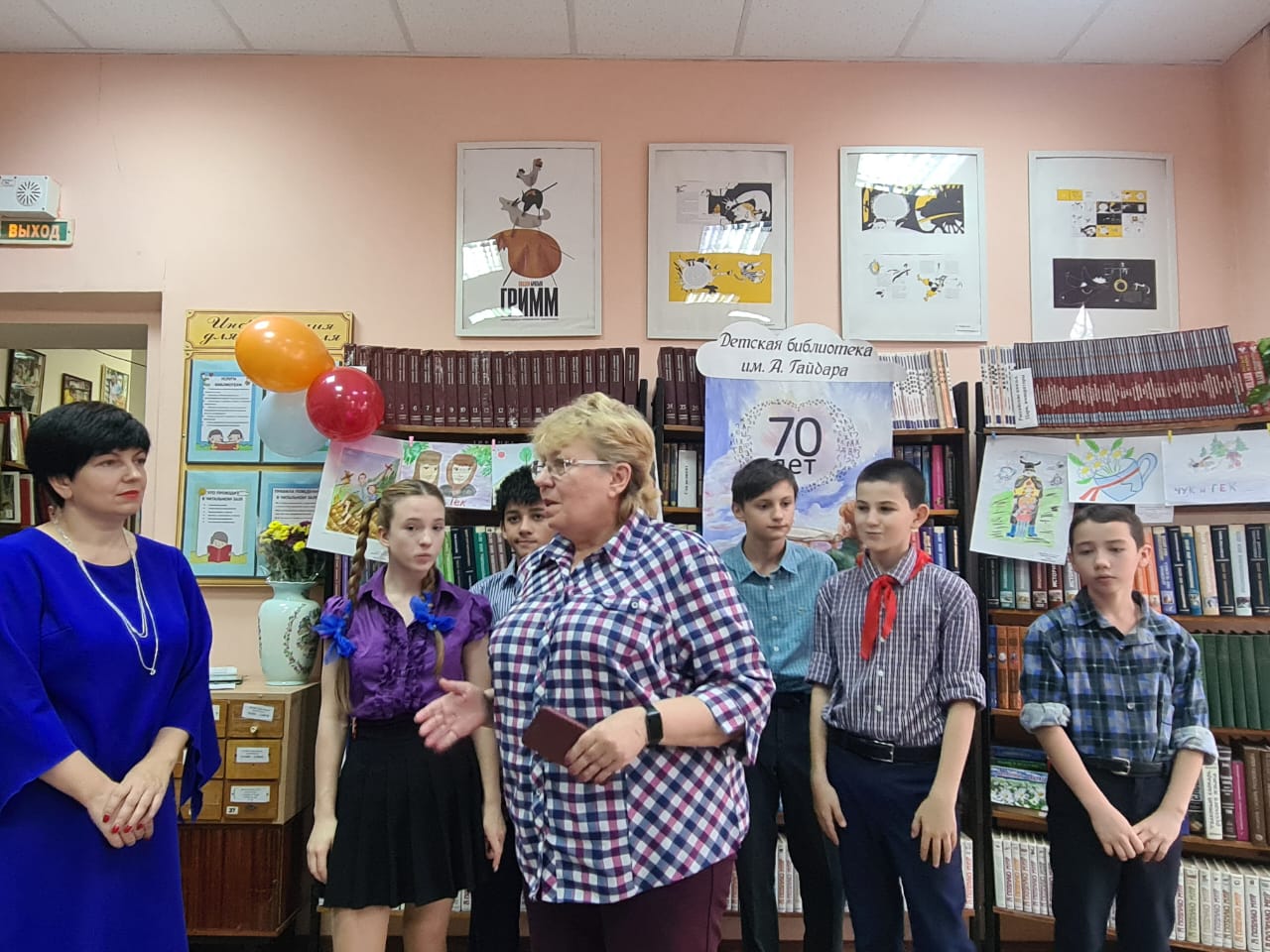 26 октября 2023 года младшая группа Студии театральных миниатюр «Подмостки» (руководитель Фролова Н.В.) пришла в Детскую библиотеку имени А.Гайдара – филиал № 2 МБЦК ЦБС г. Таганрога поздравить коллектив с юбилеем - 70-летием. В качестве подарка юные актеры подготовили отрывок из произведения А.Гайдара «Тимур и его команда».